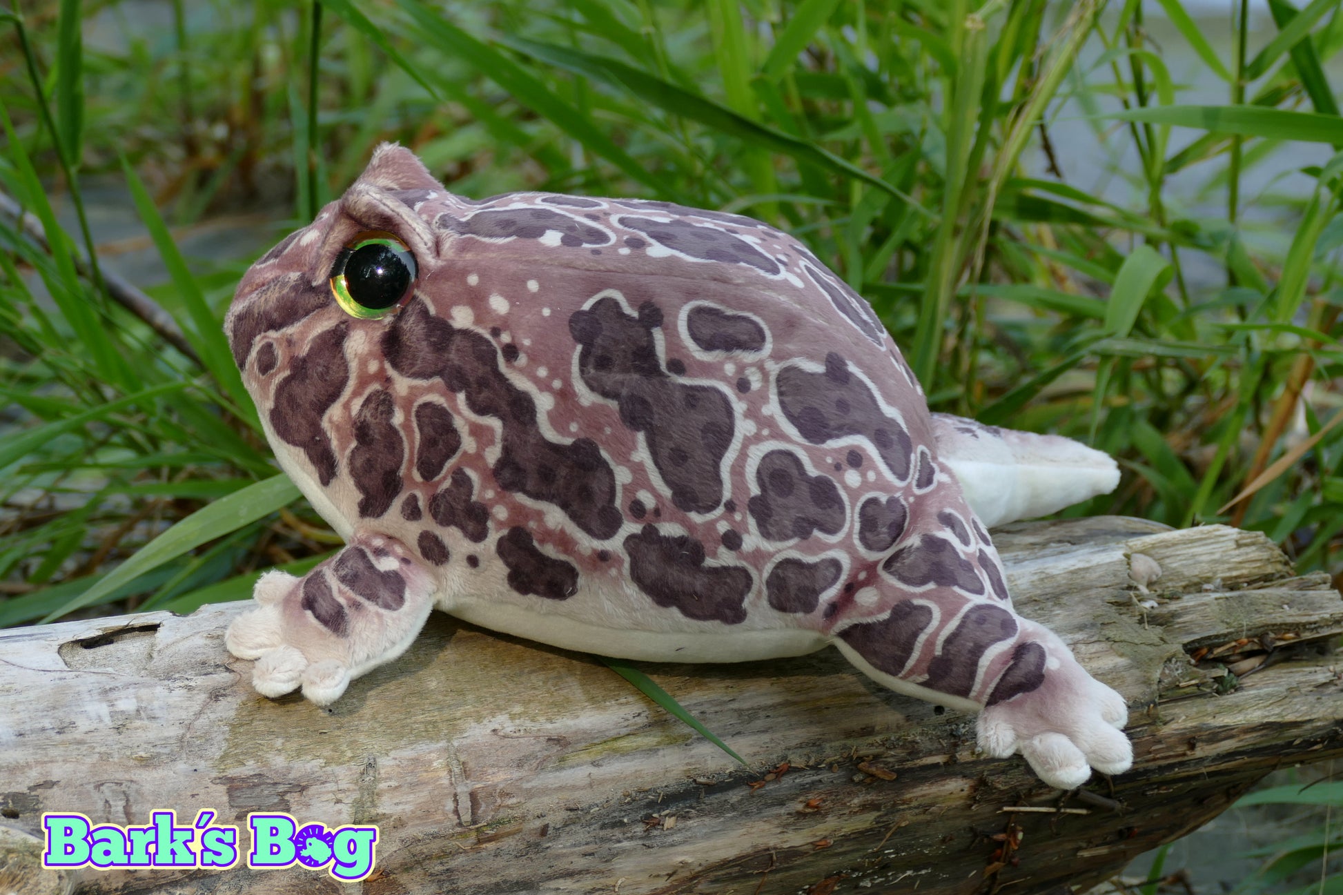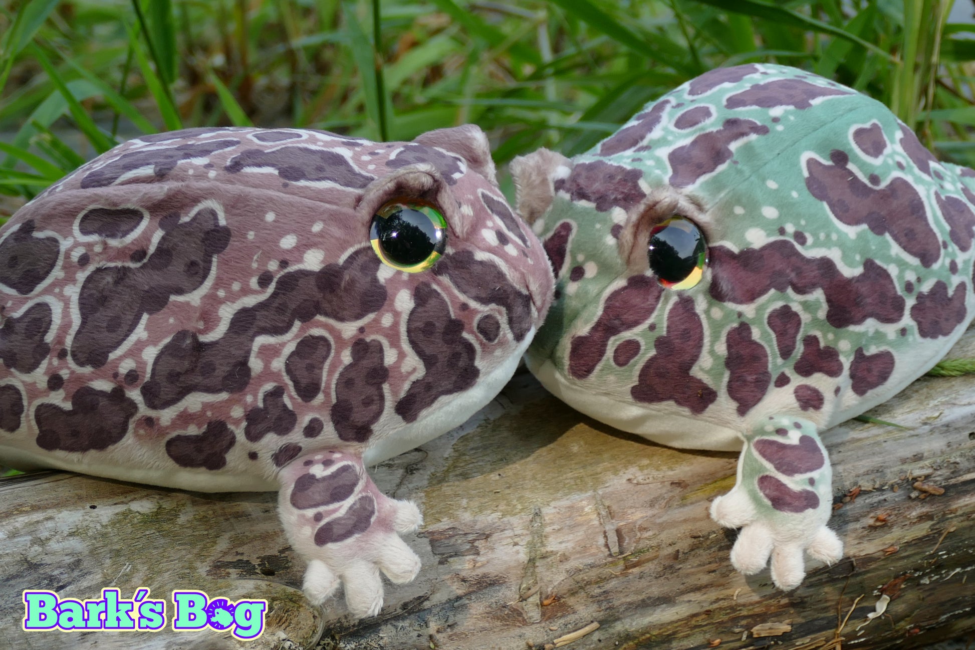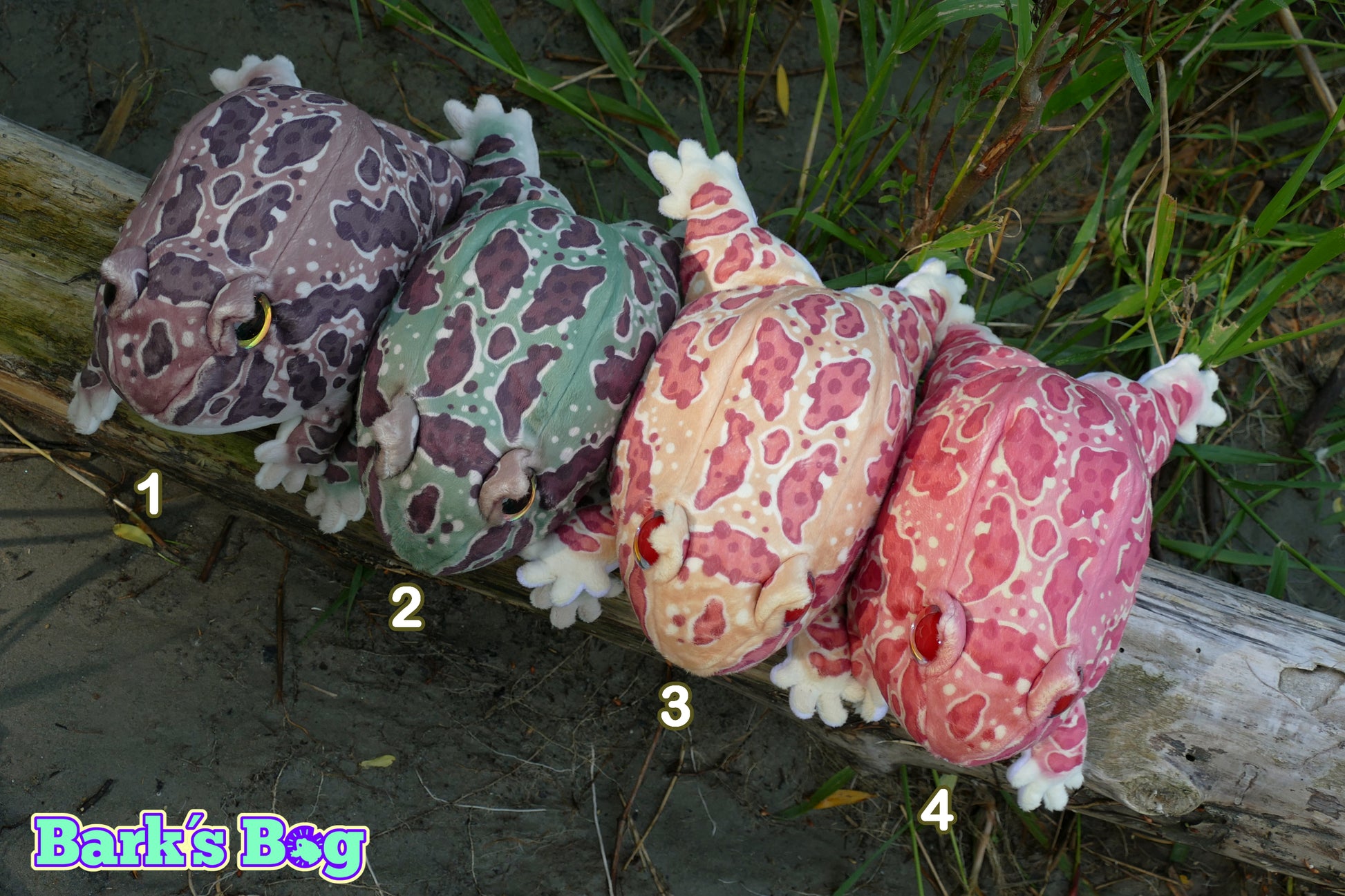 plushies based on Pacman Frogs (Ceratophrys cranwelli) which native to south america and commonly kept as pets. They come in many different color morphs and are famous for their big appetites and ability to sit motionless in the dirt for many hours.