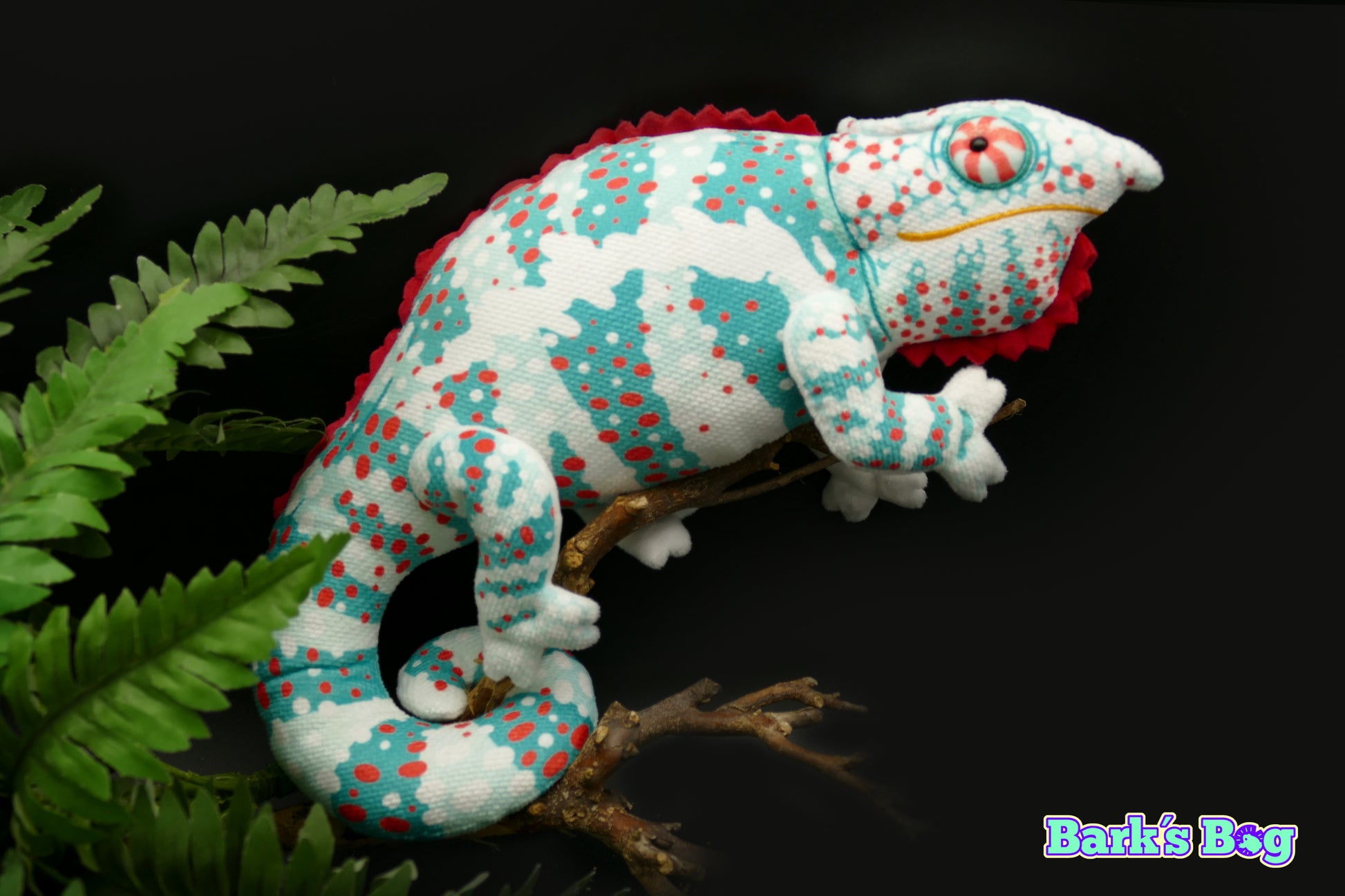 Plushies based on Panther Chameleons (Furcifer pardalis) found in the region around Nosy Faly (Madagascar). They have magnetic little feets and teddy joints!