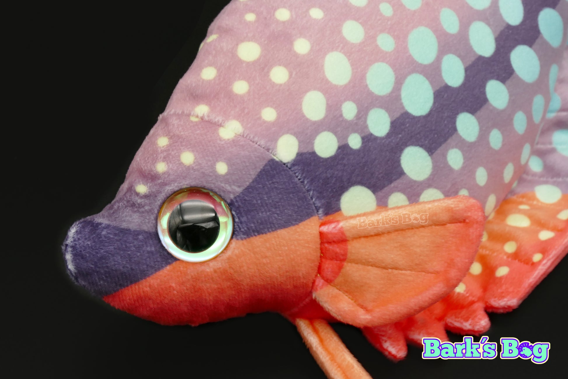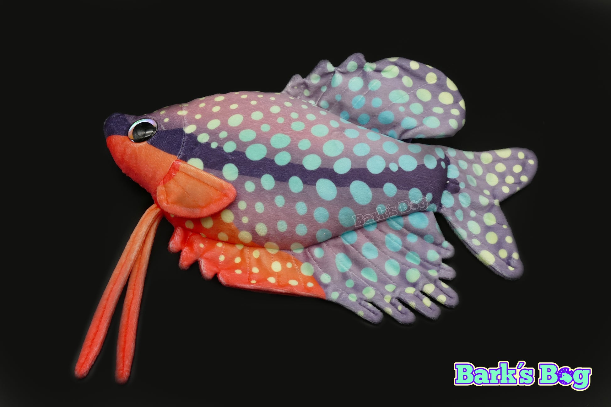 Plushies based on Pearl Gouramis (Trichopodus leerii), a popular freshwater fish in the aquarium hobby. These big fish are made from soft minky!