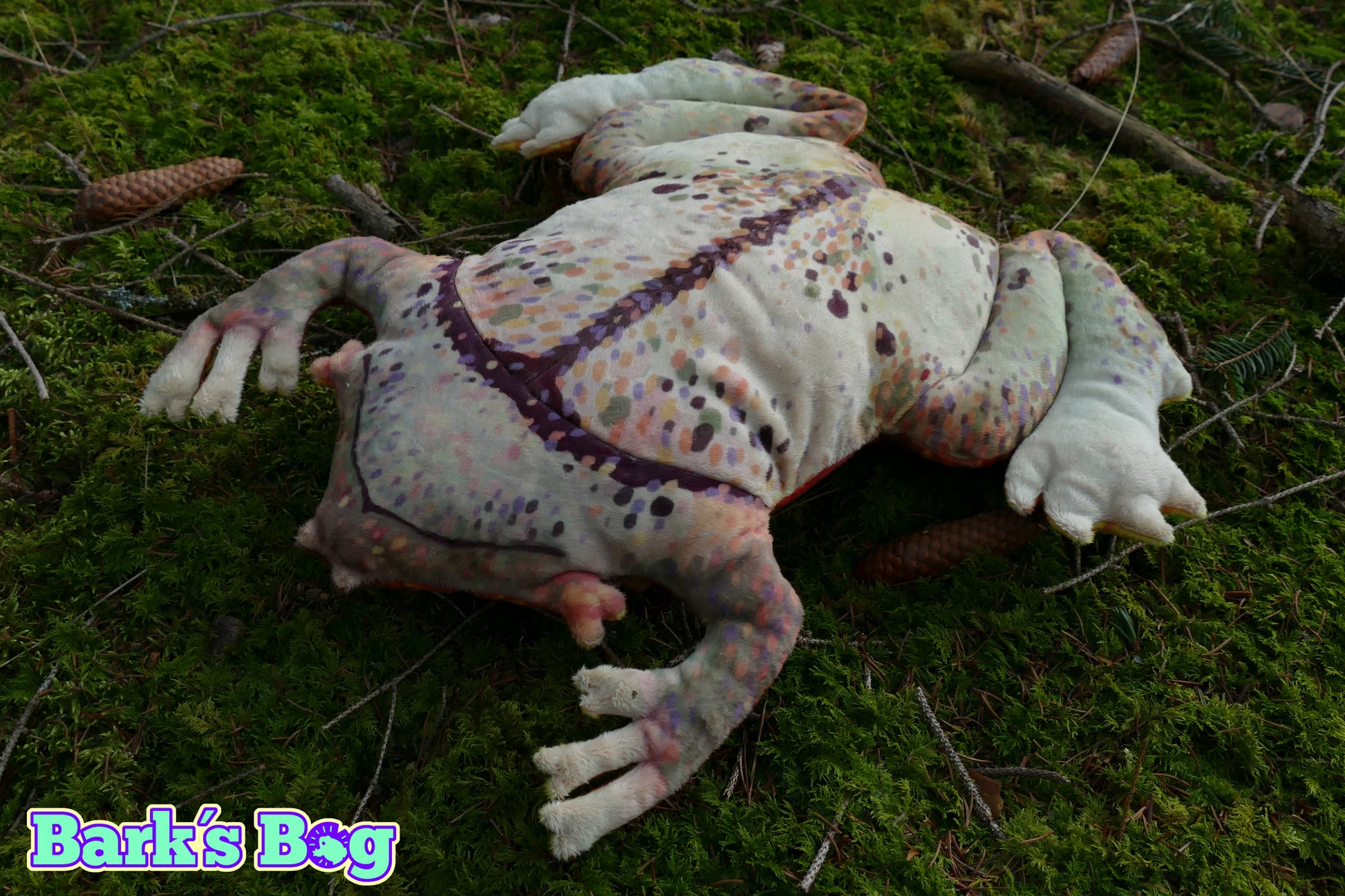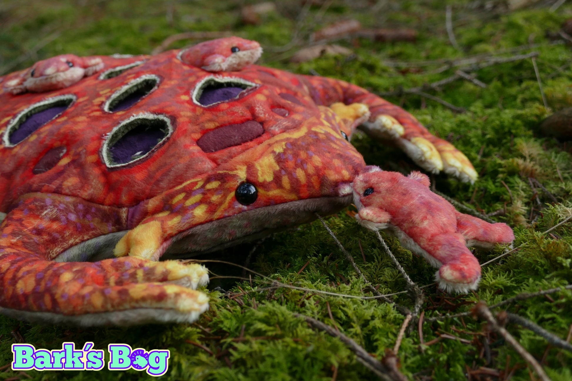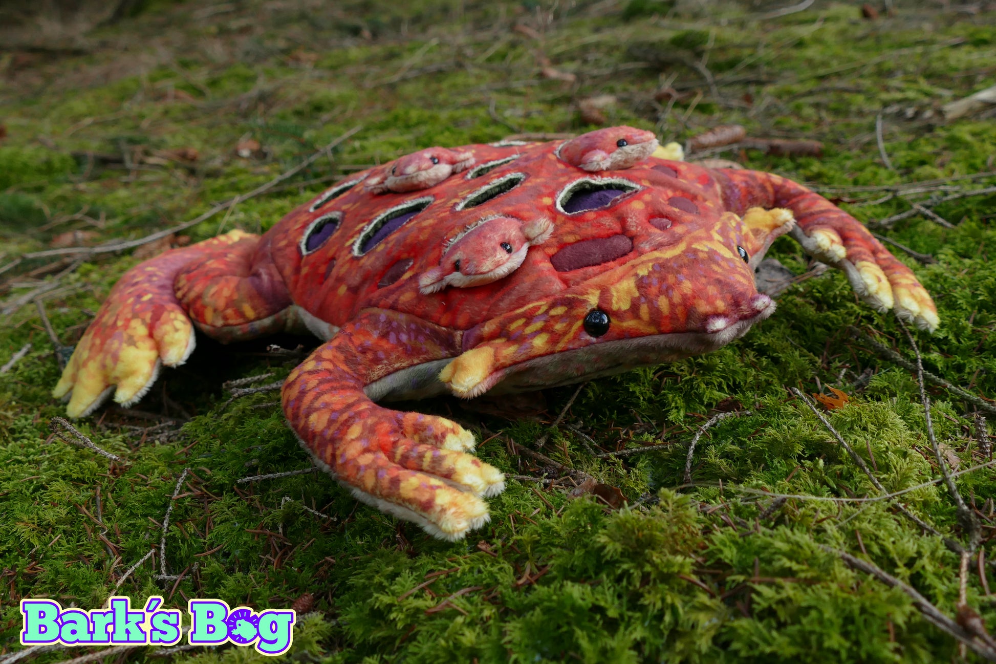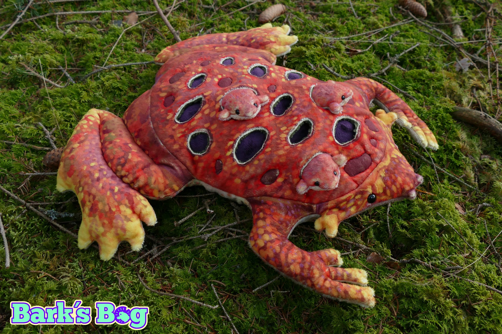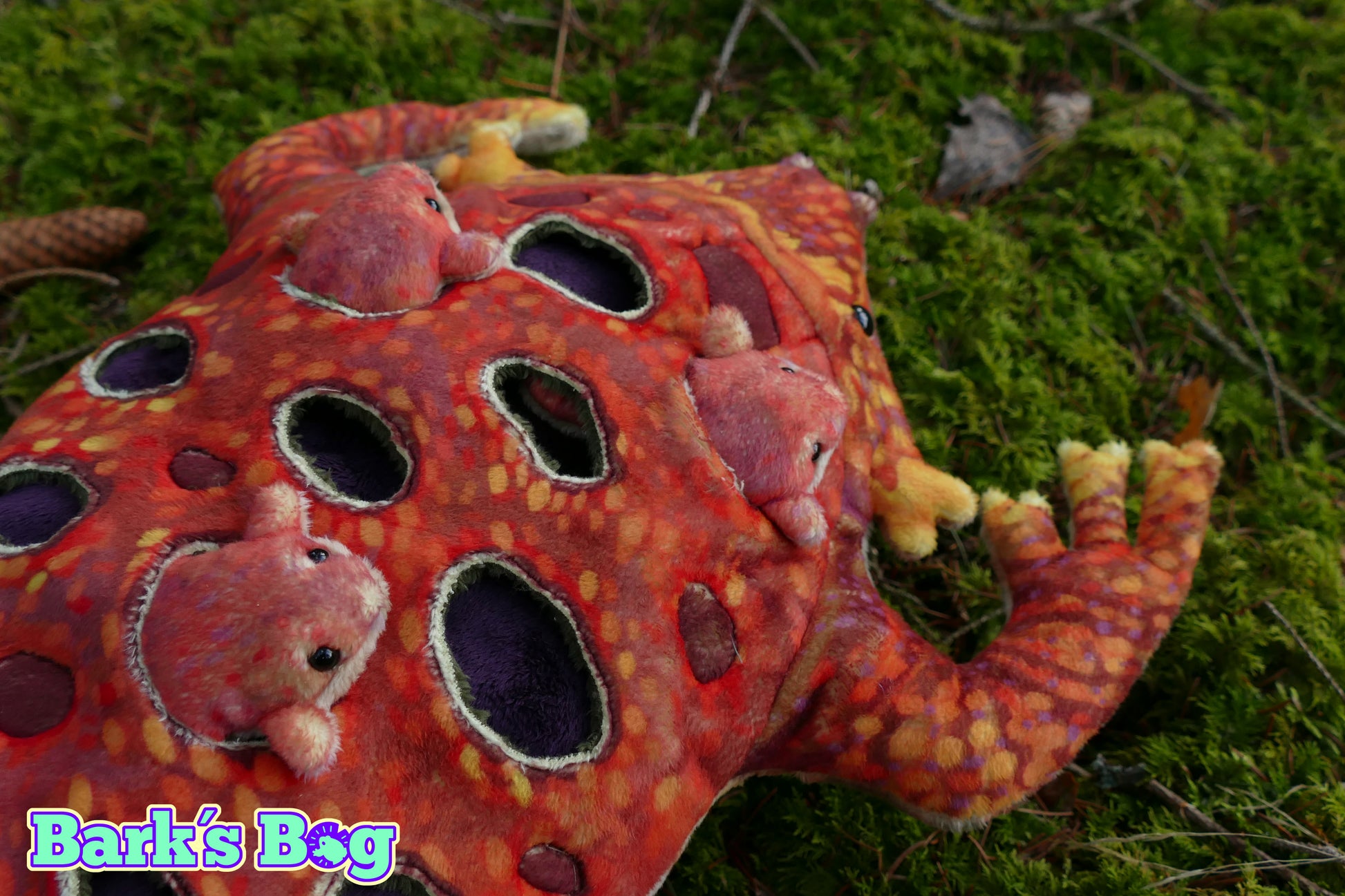 Plushies based on Surinam Toads (Pipa pipa). They have holes in their backs to hold babies in. Three babies are included in the price!